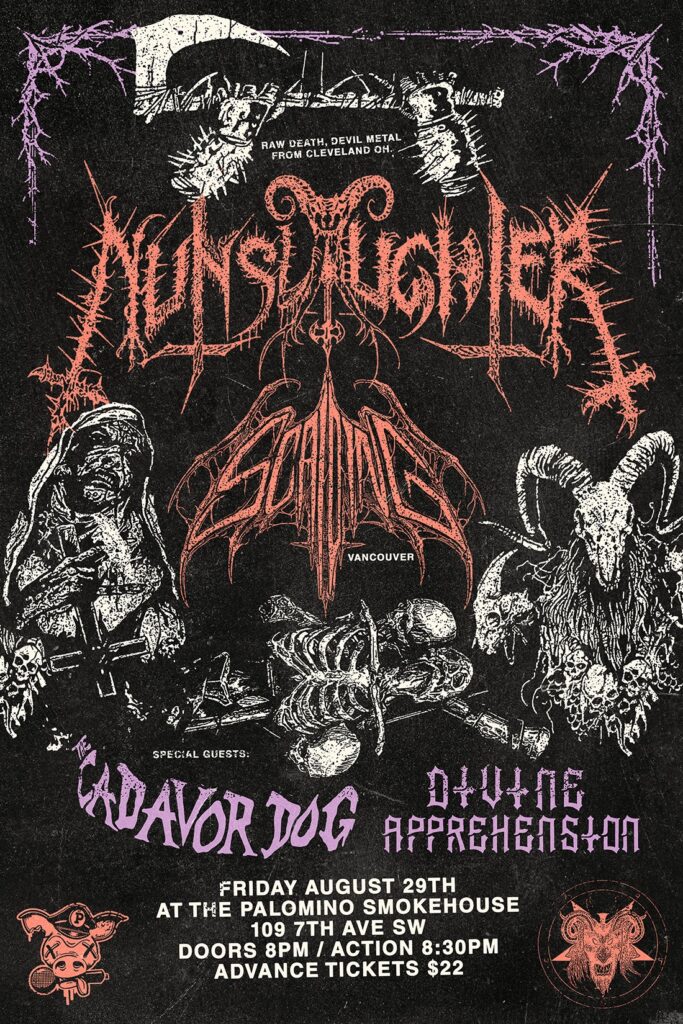 NunSlaughter(Cleveland, OH), Scalding (Vancouver), The Cadavor Dog and Divine Apprehension Where: Palomino Smokehouse and Social Club 109 7 Avenue S.W Calgary http://thepalomino.ca/ 18+ with government issued identification When: Friday August 29, 2025 Doors: 8:00pm / Action 8:30pm Admission: $22.00 advance at www.showpass.com NO JERK POLICY ALWAYS IN EFFECT!! NunSlaghter (Cleveland, OH) Legendary Raw, Underground Death […]