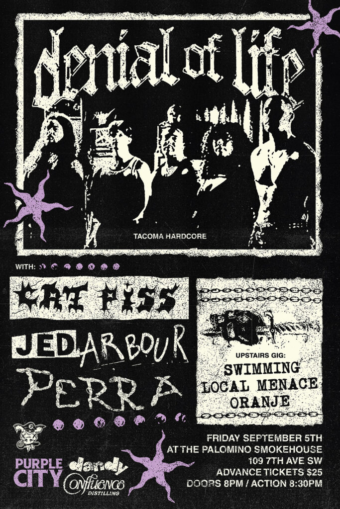Purple City presents Denial of Life with Cat Piss, Jed Arbour and Perra. UPSTAIRS Swimming, Local Menace and Oranje Where: Palomino Smokehouse and Social Club 109 7 Avenue S.W Calgary http://thepalomino.ca/ 18+ with government issued identification When: Friday September 5, 2025 Doors: 8:00pm / Music 8:30pm Admission: $25.00 advance at www.showpass.com NO JERK POLICY ALWAYS […]
