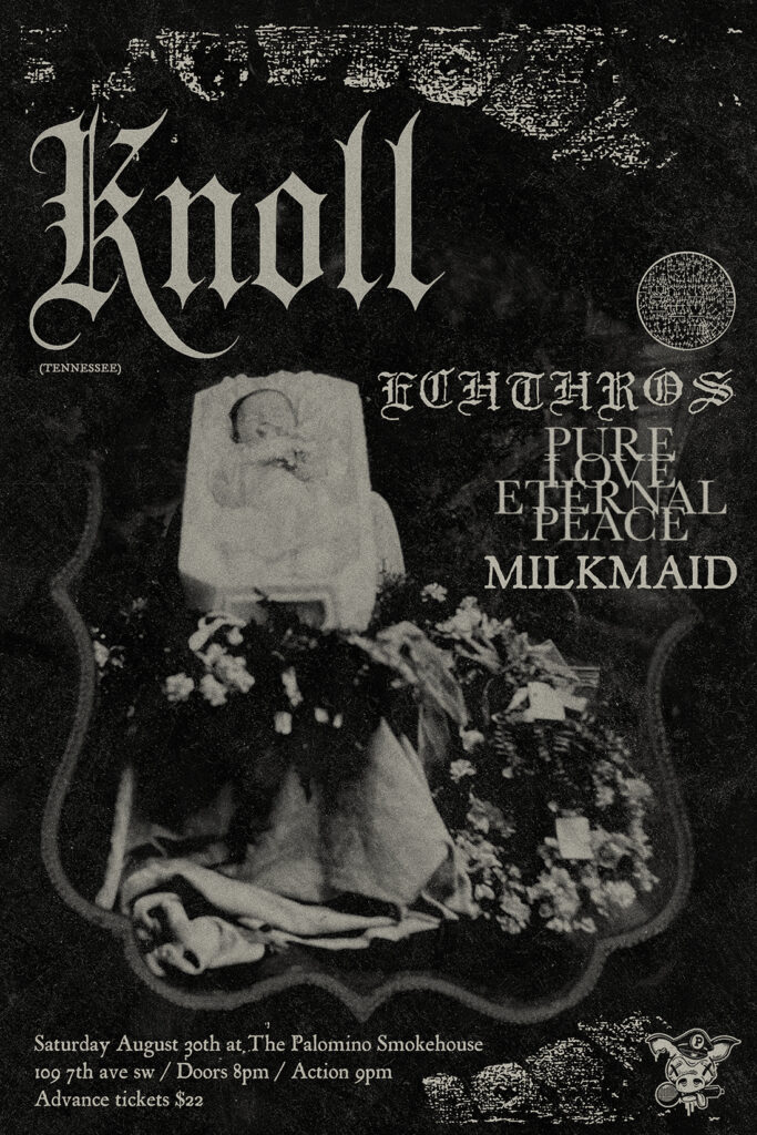 KNOLL (Tennessee) with special guests Echthro, Pure Love Eternal Peace (Winlaw, British Columbia) and Milk Maid (Palomino debut) Where: Palomino Smokehouse and Social Club 109 7 Avenue S.W Calgary http://thepalomino.ca/ 18+ with government issued identification When: Saturday August 30, 2025 Doors: 8:00pm / Action 9:00pm Admission: $22.00 advance at www.showpass.com NO JERK POLICY ALWAYS IN […]