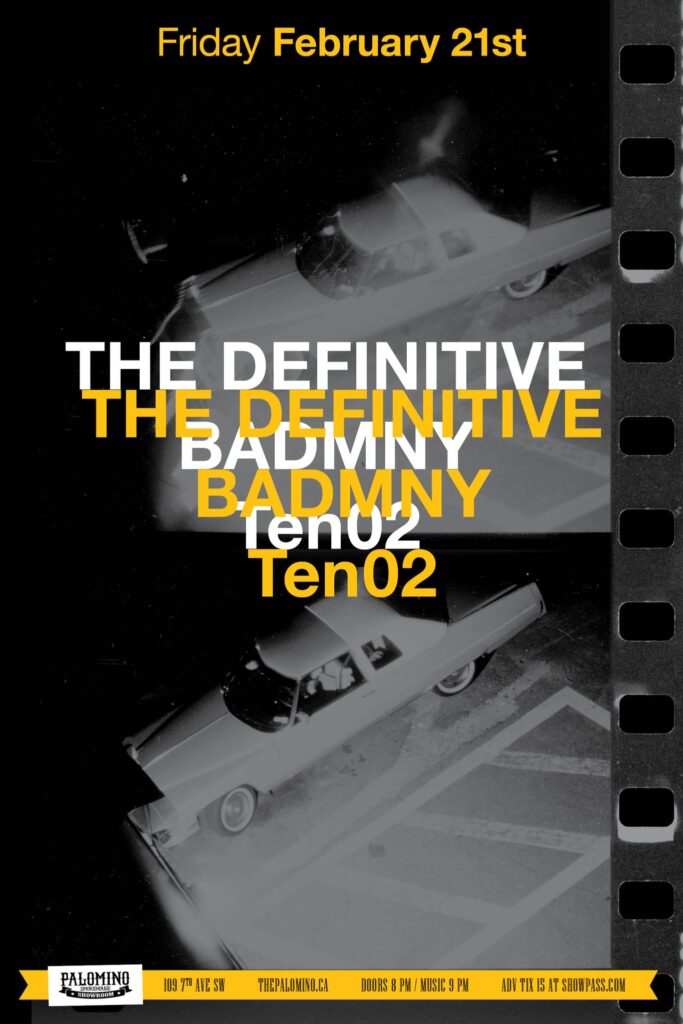 The Definitive, Badmny and Ten02 Where: Palomino Smokehouse and Social Club 109 7 Avenue S.W Calgary Home Page 18+ with government issued identification When: Friday February 21, 2025 Doors: 8:00pm / Music 9:00pm Admission: $15.00 advance at www.showpass.com NO JERK POLICY ALWAYS IN EFFECT!! The Definitive Energetic classic rock https://thedefinitive.ca https://www.instagram.com/thedefinitiveofficial Badmny Pop influenced alternative […]