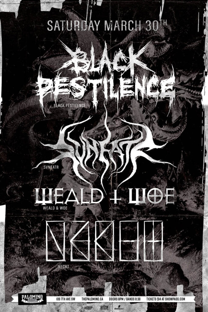 Black Pestilence, Svneatr, Weald & Woe, Necht Where: Palomino Smokehouse and Social Club 109 7 Avenue S.W Calgary Home Page 18+ with government issued identification When: Saturday March 30th, 2024 Doors: 8:00pm / Band 8:30pm Admission: $14.00 advance at www.showpass.com NO JERK POLICY ALWAYS IN EFFECT!! Black Pestilence Chaotic Black Metal https://blackpestilence.bandcamp.com https://www.instagram.com/blackpestilence https://www.facebook.com/blackpestilenceband Svneatr […]