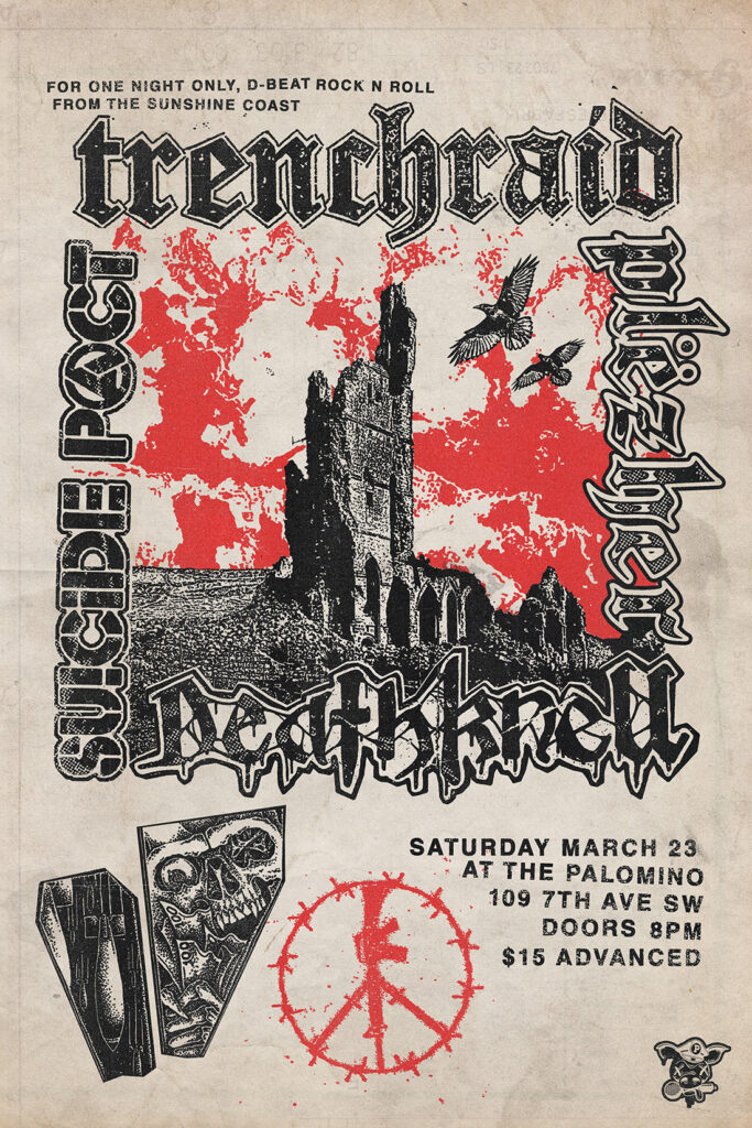 Deathknell, Trenchraid, Plëzher, Suicide Pact Where: Palomino Smokehouse and Social Club 109 7 Avenue S.W Calgary Home Page 18+ with government issued identification When: Saturday March 23rd, 2024 Doors: 8:00pm / bands 8:30pm Admission: $15.00 advance at www.showpass.com NO JERK POLICY ALWAYS IN EFFECT!! Deathknell Crust Punk Rock. https://deathknellpunk.bandcamp.com https://www.instagram.com/deathknellpunk Trenchraid (Sechelt, BC) D-beat rock […]