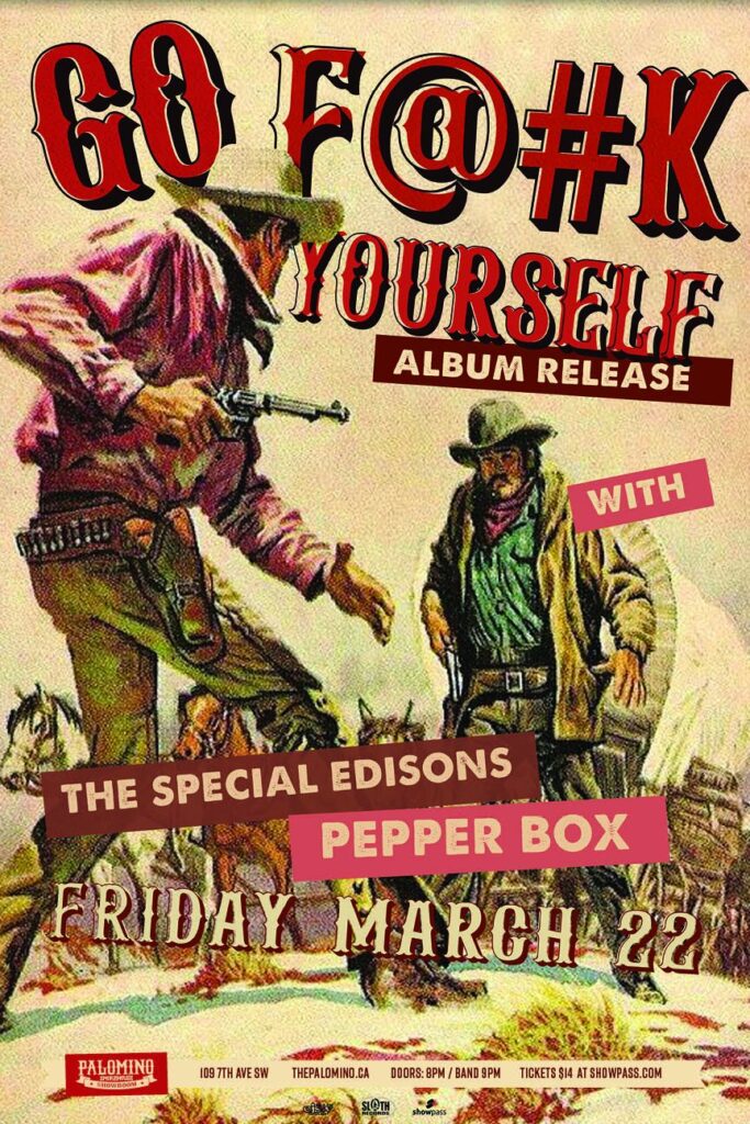 Go F@#K Yourself album release with The Special Edisons and Pepper Box Where: Palomino Smokehouse and Social Club 109 7 Avenue S.W Calgary Home Page 18+ with government issued identification When: Friday March 22rd, 2024 Doors: 8:00pm / bands 9:00pm Admission: $14.00 advance at www.showpass.com NO JERK POLICY ALWAYS IN EFFECT!! Go F@#K Yourself Punk […]