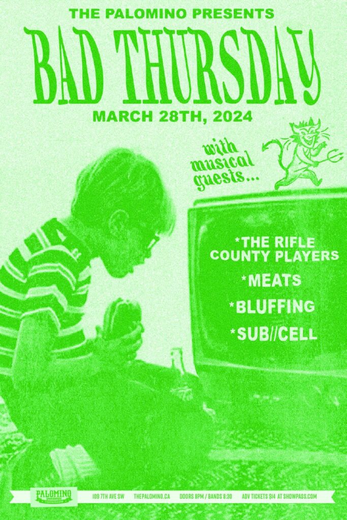 The Rifle County Players, MEATS, Bluffing, SUB//CELL Where: Palomino Smokehouse and Social Club 109 7 Avenue S.W Calgary Home Page 18+ with government issued identification When: Thursday March 28, 2024 Doors: 8:00pm / bands 8:30pm Admission: $14.00 advance at www.showpass.com NO JERK POLICY ALWAYS IN EFFECT!! The Rifle County Players Post Western Country Punk https://www.instagram.com/the.rifle.county.players […]