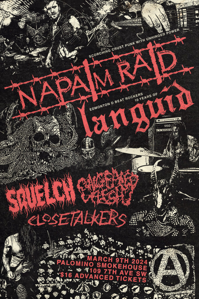 Napalm Raid, Languid, Squelch, Congealed Flesh, Closetalkers Where: Palomino Smokehouse and Social Club 109 7 Avenue S.W Calgary Home Page 18+ with government issued identification When: Saturday March 9, 2024 Doors: 8:00pm / Bands 9:00pm Admission: $16.00 advance at www.showpass.com NO JERK POLICY ALWAYS IN EFFECT!! Napalm Raid Scorching crust punk with unhinged power. https://napalmraid.bandcamp.com/ […]