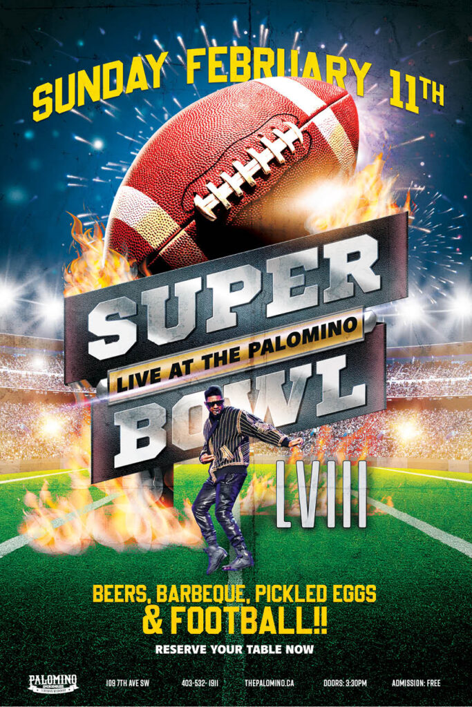 Super Bowl LVIII LIVE at The Palomino Smokehouse Where: Palomino Smokehouse and Social Club 109 7 Avenue S.W Calgary Home Page 18+ with government issued identification When: Sunday February 11, 2024 Admission: FREE Doors: 3:30pm NO JERK POLICY ALWAYS IN EFFECT!! BEERS, BARBEQUE, PICKLED EGGS & FOOTBALL!!! This is the first Super Bowl that will […]