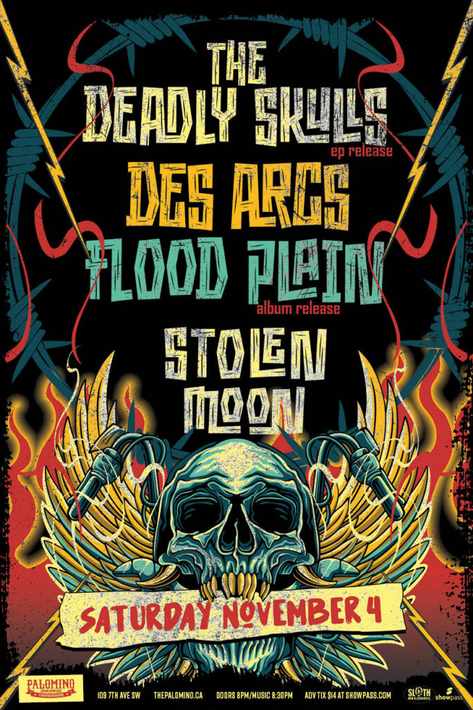 The Deadly Skulls (EP release), Des Arcs, Flood Plain (album Release), Stolen Moon Where: Palomino Smokehouse and Social Club 109 7 Avenue S.W Calgaryhttp://thepalomino.ca/18+ with government issued identificationWhen: Saturday November 4, 2023Doors: 8:00pm / Bands 8:30pmAdmission: $14.00 advance at www.showpass.comNO JERK POLICY ALWAYS IN EFFECT!! The Deadly Skulls (EP release)Don’t give people what they want. […]