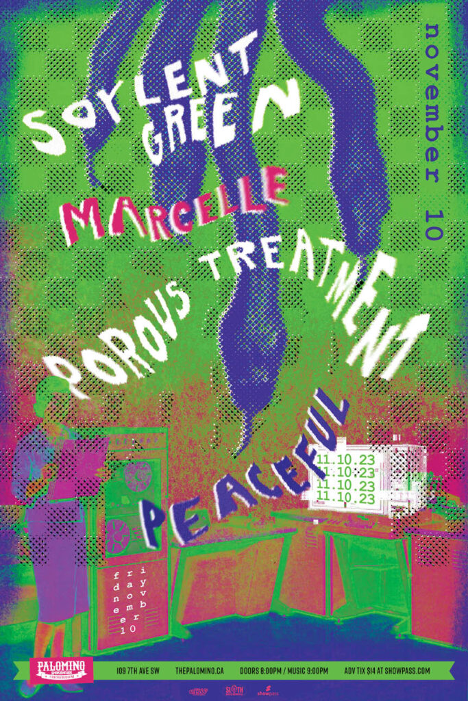 Soylent Green, Marcelle, Porous Treatment and Peaceful. Where: Palomino Smokehouse and Social Club 109 7 Avenue S.W Calgary Home Page 18+ with government issued identification When: Friday November 10, 2023 Doors: 8:00pm / bands 9:00pm Admission: $14.00 advance at www.showpass.com NO JERK POLICY ALWAYS IN EFFECT!! Soylent Green: 3 piece noise influenced punk band Porous […]