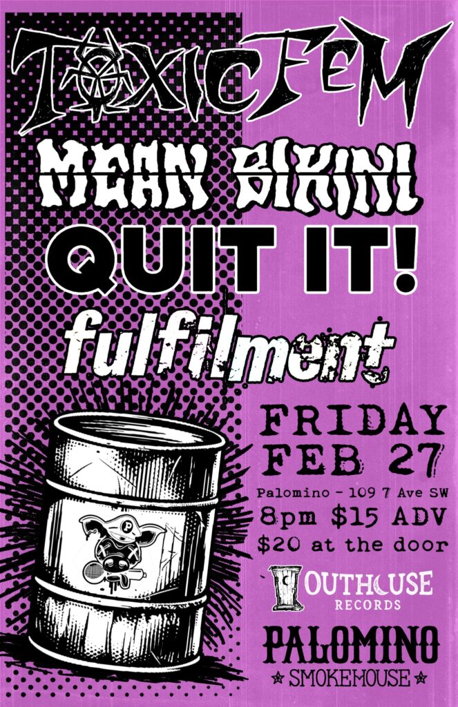 Toxic Fem, Mean Bikini, Quit It! Fulfilment Where: Palomino Smokehouse and Social Club 109 7 Avenue S.W Calgary http://thepalomino.ca/ 18+ with government issued identification When: Friday Febraury 27, 2026 Doors: 8:00pm / Action 9:00pm Admission: $15.00 advance at www.showpass.com NO JERK POLICY ALWAYS IN EFFECT!! Toxic Fem In-your-face feminist punk https://www.instagram.com/toxicfemband Mean Bikini Queer. Political. […]