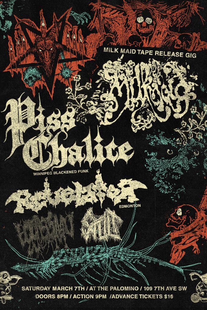 Milkmaid Tape Release with Piss Chalice (Winnipeg), Stult, Revelator (Edmonton) and Ectoplasmic Worm Where: Palomino Smokehouse and Social Club 109 7 Avenue S.W Calgary http://thepalomino.ca/ 18+ with government issued identification When: Saturday March 7, 2026 Doors: 7:00pm / Action 7:30pm Admission: $16.00 advance at www.showpass.com NO JERK POLICY ALWAYS IN EFFECT!! Milkmaid Tribal Post Sludge […]