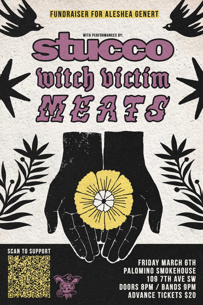 Fire Relief and Recovery Fundraiser for Aleshea Genert featuring Stucco, Witch Victim and MEATS Where: Palomino Smokehouse and Social Club 109 7 Avenue S.W Calgary http://thepalomino.ca/ 18+ with government issued identification When: Friday March 6, 2026 Doors: 8:00pm / Action 9:00pm Admission: $20.00 advance at www.showpass.com NO JERK POLICY ALWAYS IN EFFECT!! David Howard Genert […]