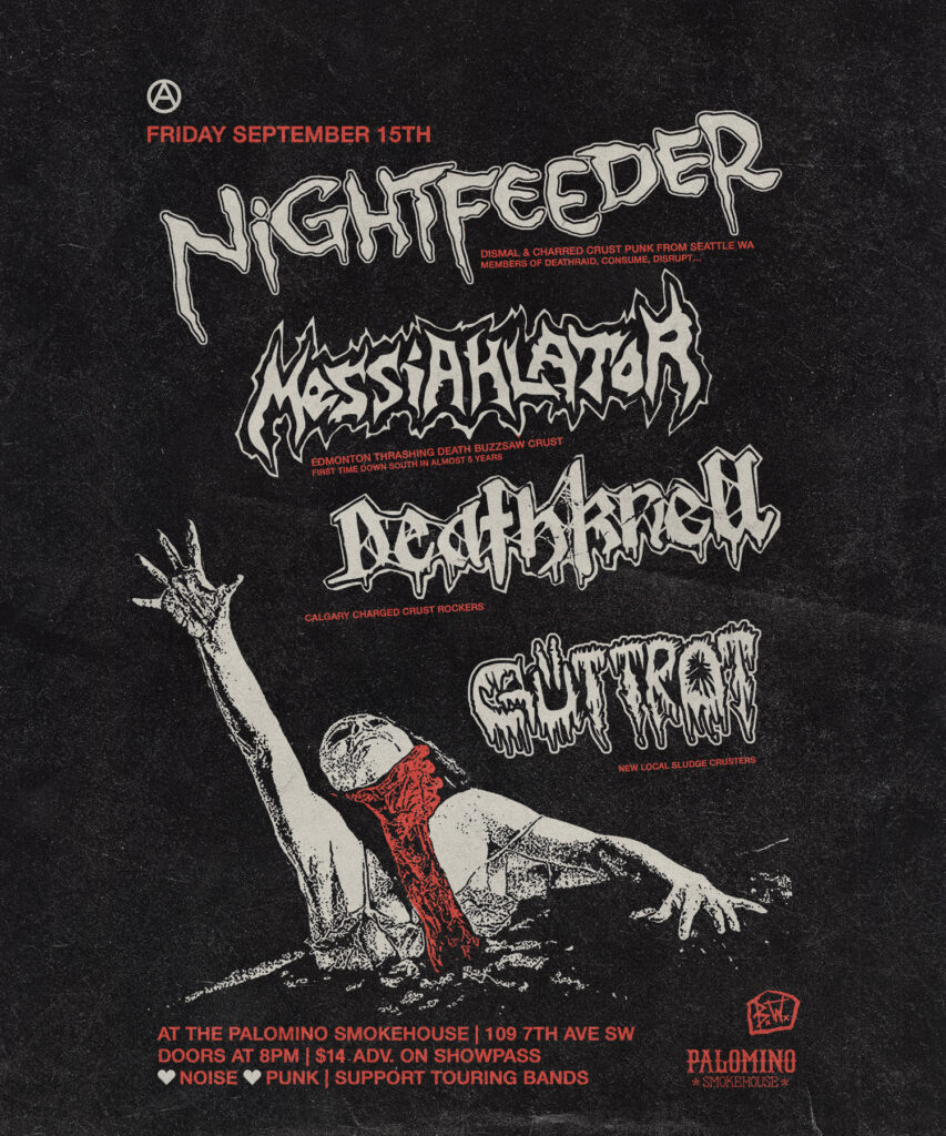 Nightfeeder, Messiahlator Deathknell, Guttrot Where: Palomino Smokehouse and Social Club 109 7 Avenue S.W Calgary / UPSTAIRS Home Page 18+ with government issued identification When: Friday September 15, 2023 Doors: 8:00pm Admission: $14.00 advance at www.showpass.com NO JERK POLICY ALWAYS IN EFFECT!! Nightfeeder (Seattle) Dismal & Charred Crust Punks featuring members from Deathraid, Consume, Disrupt […]
