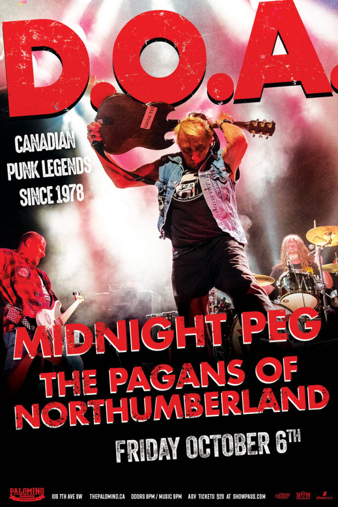 Canadian Punk Legends D.O.A with Midnight Peg (Edmonton) and The Pagans of Northumberland Where: Palomino Smokehouse and Social Club 109 7 Avenue S.W Calgary http://thepalomino.ca/ 18+ with government issued identification When: Friday October 6, 2023 Doors: 8:00pm / bands 9:00pm Admission: $20.00 advance at www.showpass.com NO JERK POLICY ALWAYS IN EFFECT!! D.O.A Canada’s legendary Punk […]
