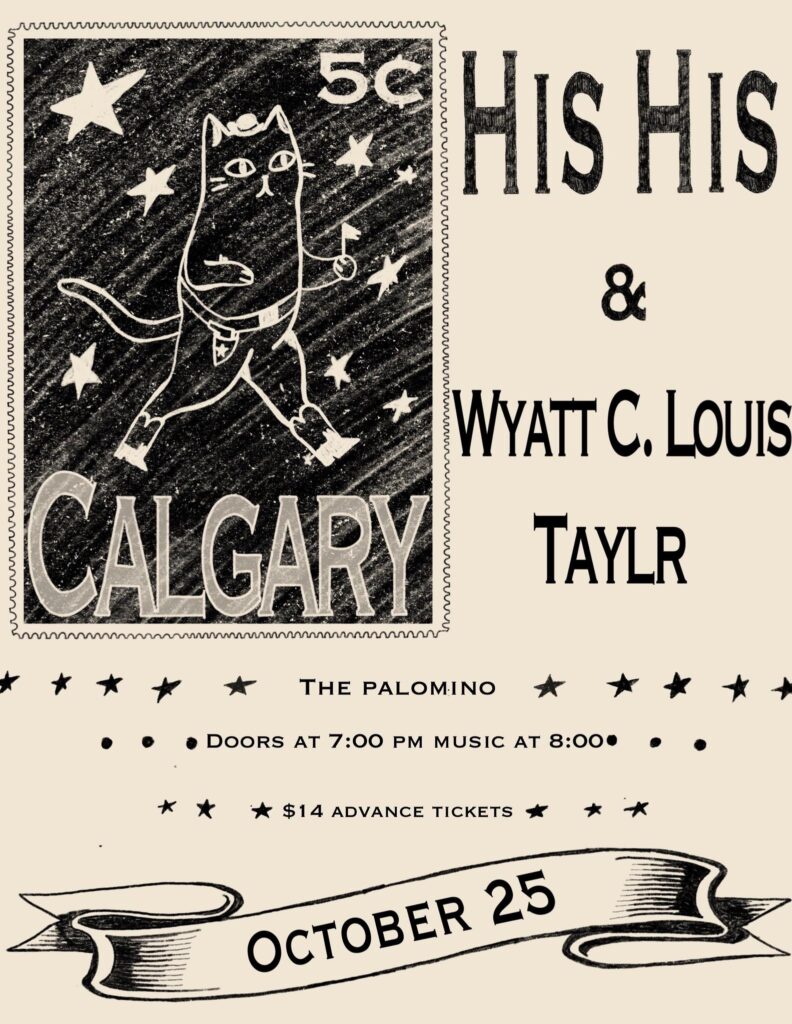 His His, Wyatt C. Louis and Taylr Where: Palomino Smokehouse and Social Club 109 7 Avenue S.W Calgary http://thepalomino.ca/ 18+ with government issued identification When: Wednesday October 25, 2023 Admission: $14.00 advance at www.showpass.com Doors: 7:00pm / Music 8:00pm NO JERK POLICY ALWAYS IN EFFECT!! His His His His is the recording project of Toronto-based […]