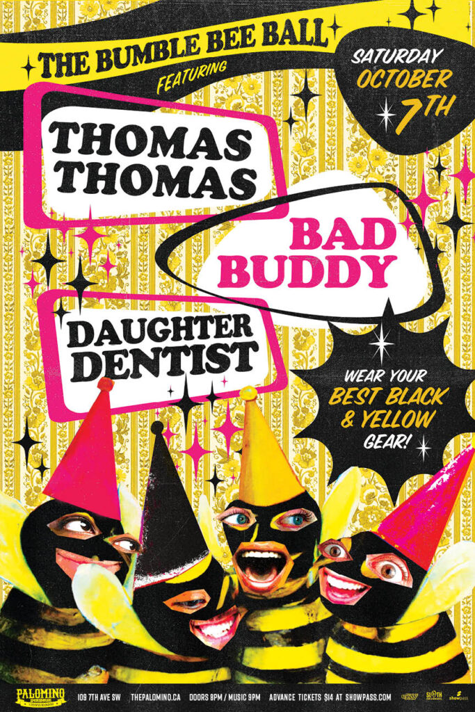 The Bumble BEE Ball with Thomas Thomas, Bad Buddy, Daughter Dentist. Wear your BEST black and yellow gear. Dance until you GLOW like HONEY!!! Where: Palomino Smokehouse and Social Club / DOWNTSTAIRS 109 7 Avenue S.W Calgary http://thepalomino.ca/ 18+ with government issued identification When: Saturday October 7, 2023 Doors: 8:00pm / bands 9:00pm Admission: $15.00 […]