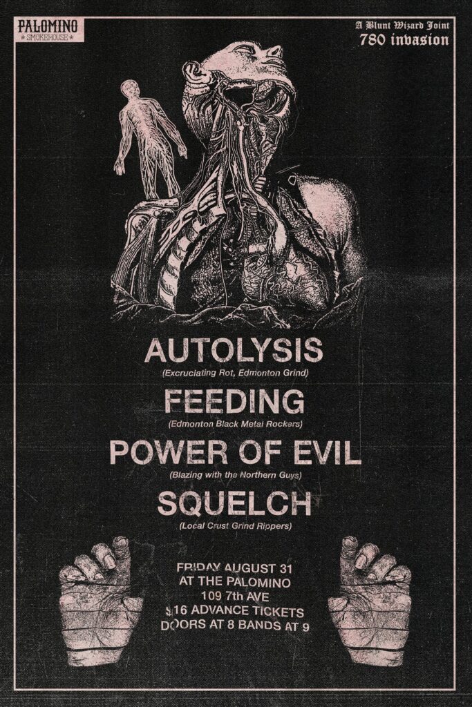 Autolysis, Feeding, Power of Evil, Squelch Where: Palomino Smokehouse and Social Club 109 7 Avenue S.W Calgary Home Page 18+ with government issued identification When: Thursday August 31, 2023 Doors: 8:00pm / Music 9:00pm Admission: $16.00 advance at www.showpass.com NO JERK POLICY ALWAYS IN EFFECT!! Autolysis Excruciating Rot https://autolysis780.bandcamp.com/ Feeding Black Metal Rockers https://feeding.bandcamp.com/ Power […]