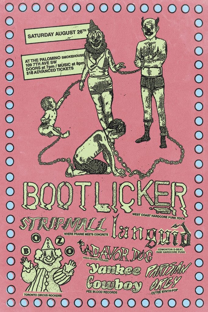Bootlicker*Stripmall*Languid*Bozo*Yankee Cowboy*Parisian Orgy*The Cadavor Dog Where: Palomino Smokehouse and Social Club 109 7 Avenue S.W Calgary Home Page 18+ with government issued identification When: Saturday August 26, 2023 Doors: 7:00pm / Music 8:00pm Admission: $18.00 advance at www.showpass.com NO JERK POLICY ALWAYS IN EFFECT!! Bootlicker (Vancouver) The catchiest D-Beat-hardcore pushed into the red, soaked in […]