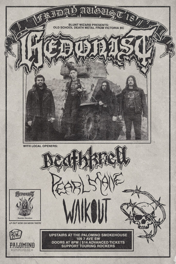 Hedonist (Victoria), Deathknell, Pearl Malè, Walkout Where: Palomino Smokehouse and Social Club / UPSTAIRS 109 7 Avenue S.W Calgary Home Page 18+ with government issued identification When: Friday August 18, 2023 Admission: $14.00 advance at www.showpass.com Doors: 8:00pm / Music 8:30 NO JERK POLICY ALWAYS IN EFFECT!! Hedonist Old school death metal https://hedonistdeathmetal.com/ https://www.instagram.com/hedonistdeathmetal/ Deathknell […]
