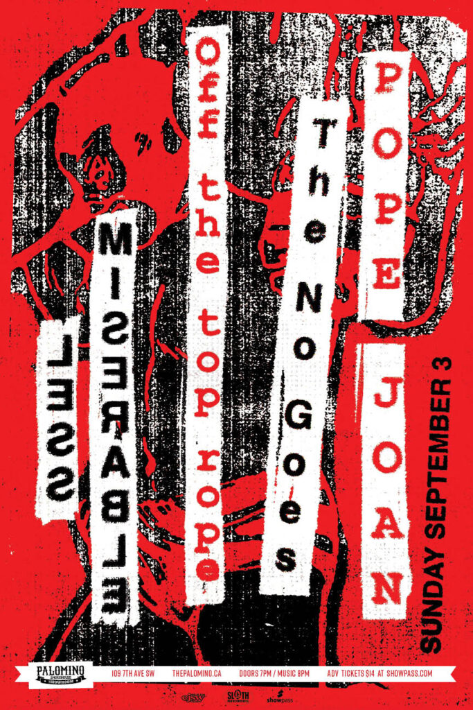Less Miserable, Off the Top Rope, The No Goes and Pope Joan Where: Palomino Smokehouse and Social Club 109 7 Avenue S.W Calgary http://thepalomino.ca/ 18+ with government issued identification When: Sunday September 3, 2023 Doors: 7:00pm / Music 8:00pm Admission: $14.00 advance at www.showpass.com NO JERK POLICY ALWAYS IN EFFECT!! Less Miserable Fronted by queer […]