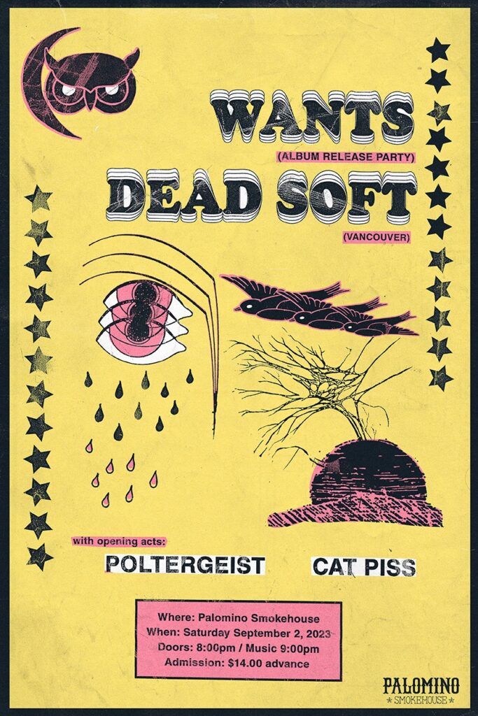 Wants album release with Dead Soft, Poltergeist and Cat Piss Where: Palomino Smokehouse and Social Club 109 7 Avenue S.W Calgary http://thepalomino.ca/ 18+ with government issued identification When: Saturday September 2, 2023 Doors: 8:00pm / Music 9:00pm Admission: $14.00 advance at www.showpass.com NO JERK POLICY ALWAYS IN EFFECT!! Wants Synth-Pop / Post-Punk music produced by […]