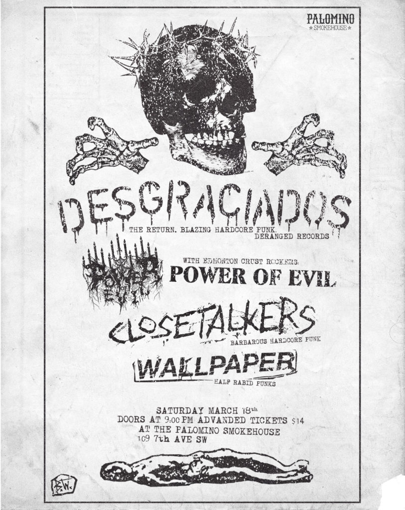 Desgraciados, Powers of Evil, Closetalkers and Wallpaper Where: Palomino Smokehouse and Social Club 109 7 Avenue S.W Calgary http://thepalomino.ca/ 18+ with government issued identification When: Saturday March 18 , 2023 Doors: 8:00pm / Music 9:00pm Admission: $14.00 advance at www.showpass.com NO JERK POLICY ALWAYS IN EFFECT!! Desgraciados Blazing hardcore punk from Deranged Records https://desgraciados.bandcamp.com/ Powers […]