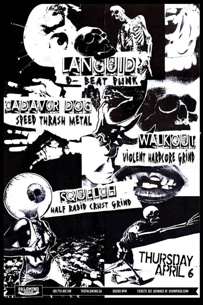 Languid, Cadavor Dog, Walkout, Squelch Where: Palomino Smokehouse and Social Club 109 7 Avenue S.W Calgary http://thepalomino.ca/ 18+ with government issued identification When: Thursday April 6, 2023 Doors: 8:00pm / Music 9:00pm Admission: $12.00 advance at www.showpass.com NO JERK POLICY ALWAYS IN EFFECT!! Languid Raw hardcore that will wipe you clean off your feet! https://languidpunk.bandcamp.com/ […]
