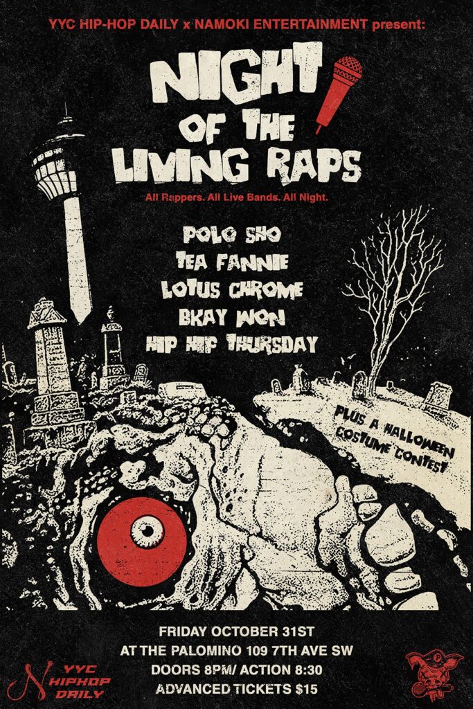 YYC Hip Daily x Namoki Entertainment presnets Night of the Living Raps: All Rappers, All Live Bands, All Night. Costumes encouraged, good time expected… Where: Palomino Smokehouse and Social Club 109 7 Avenue S.W Calgary http://thepalomino.ca/ 18+ with government issued identification When: Friday October 31, 2025 Doors: 8:00pm / Action 8:30pm Admission: $15.00 advance at […]