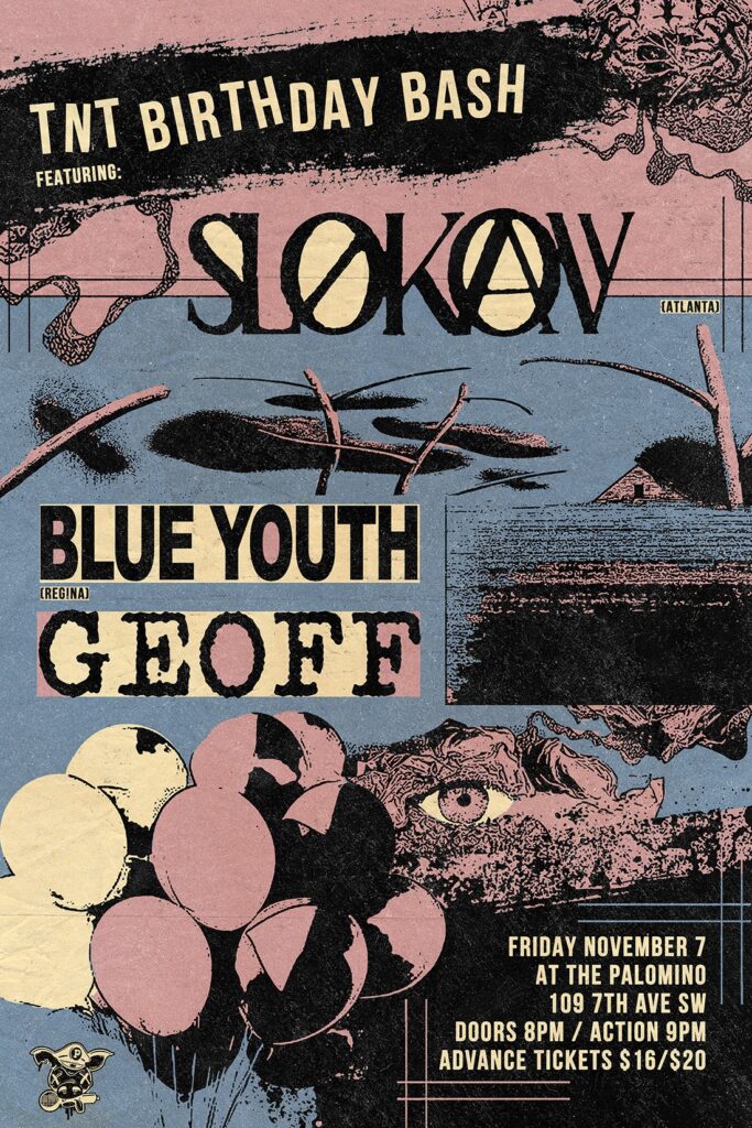 “TNT Birthday Bash” Featuring Slokav (Atlanta), Blue Youth (Regina), Geoff Where: Palomino Smokehouse and Social Club 109 7 Avenue S.W Calgary http://thepalomino.ca/ 18+ with government issued identification When: Friday November 7, 2025 Doors: 8:00pm / Hot Action 9:00pm Admission: $16.00 advance at www.showpass.com NO JERK POLICY ALWAYS IN EFFECT!! Slokav (Atlanta) Post Hardcore Heavy Grunge […]