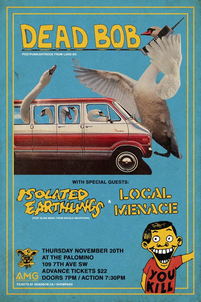 Dead Bob, Isolated Earthlings (feat Blind Marc from Dayglo Abortions) and Local Menace Where: Palomino Smokehouse and Social Club 109 7 Avenue S.W Calgary http://thepalomino.ca/ 18+ with government issued identification When: Thursday November 20, 2025 Doors: 7:00pm / Action 7:30pm Admission: $22.00 advance at www.showpass.com NO JERK POLICY ALWAYS IN EFFECT!! Dead Bob Dead Bob […]
