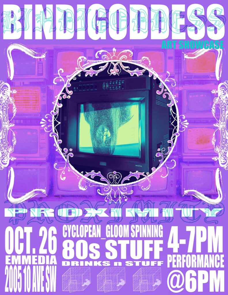 BINDIGODDESS presents Proximity. Mulitmedia installation, mixedmedia art and LIVE performance by BINDIGODDESS, Meghana Iyer created during her month long residncey at EEMEDIA. Drunks and Stuff with guest selector Cyclopean Gloom spinning 80s Stuff. Where: EMMEDIA Gallery 2005 10 Ave SW, Calgary, AB T3C 0K4 https://emmedia.ca All Ages Welcome When: Sunday October 26, 2025 Doors: 4pm […]