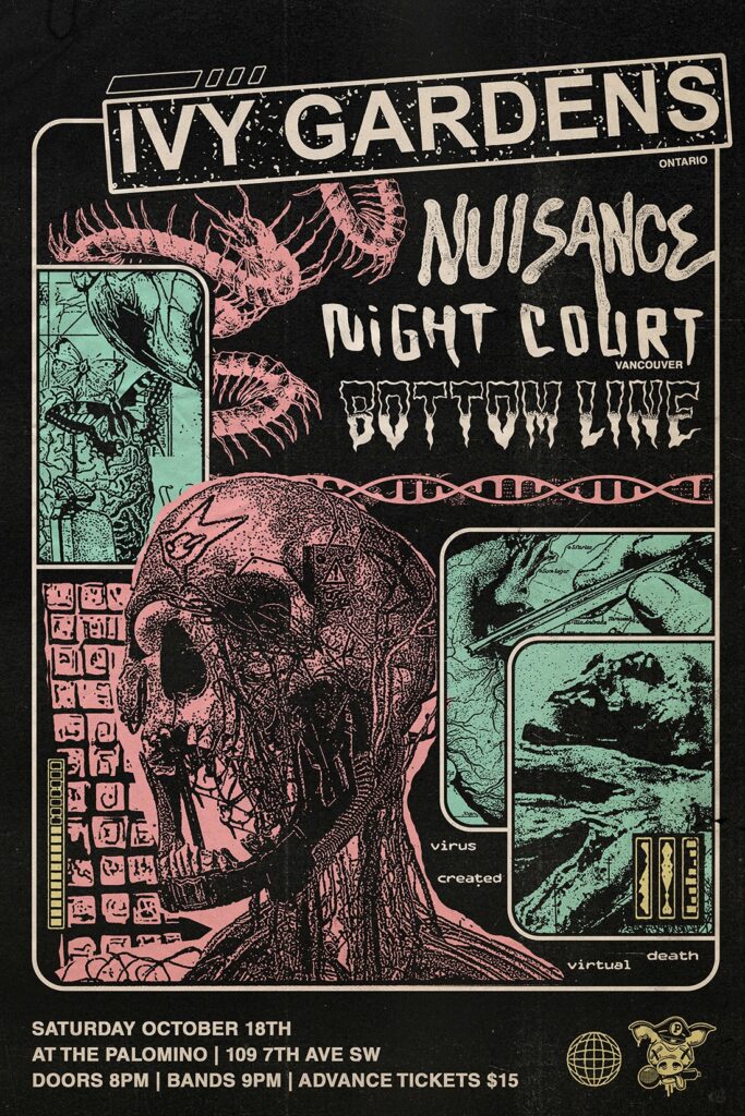 Ivy Gardens (Niagara, Ontario), Nuisance, Night Court (Vancouver), Bottom Line Where: Palomino Smokehouse and Social Club 109 7 Avenue S.W Calgary http://thepalomino.ca/ 18+ with government issued identification When: Saturday October 18, 2025 Doors: 8:00pm / Action 8:30pm Admission: $15.00 advance at www.showpass.com NO JERK POLICY ALWAYS IN EFFECT!! Ivy Gardens (Niagara, Ontario) Post-Metal, Sludge Punk […]