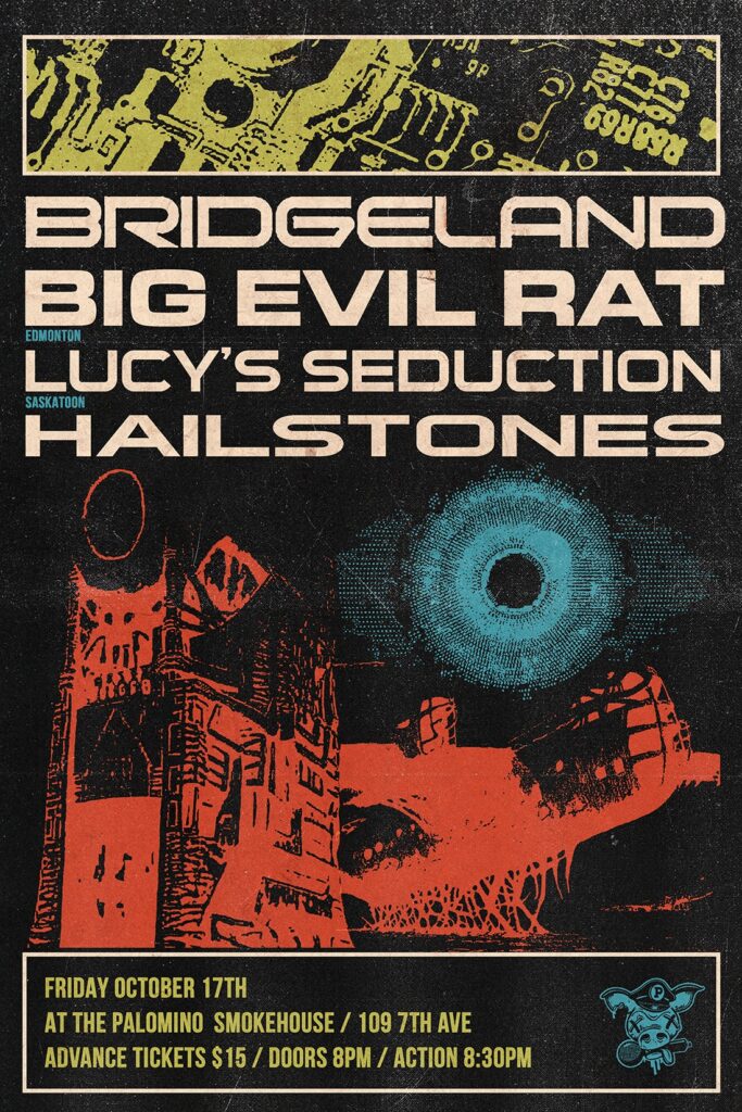 Bridgeland, Big Evil Rat (Edmonton), Lucy’s Suduction (Saskatoon), Hailstones Where: Palomino Smokehouse and Social Club 109 7 Avenue S.W Calgary http://thepalomino.ca/ 18+ with government issued identification When: Friday October 17, 2025 Doors: 8:00pm / Action 8:30pm Admission: $15.00 advance at www.showpass.com NO JERK POLICY ALWAYS IN EFFECT! Bridgeland Post-Krautrock https://www.instagram.com/brid_geland Big Evil Rat (Edmonton) Wierdo […]